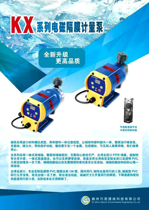 KX系列電磁計(jì)量泵是由微處理器控制、短沖程、電磁驅(qū)動(dòng)的隔膜型計(jì)量泵。VKV系列計(jì)量泵以其、地性能、優(yōu)越的性價(jià)比多年來(lái)受到廣大用戶的一致好評(píng)。由于泵頭材質(zhì)具有良好的耐化學(xué)腐蝕性能,因而可以對(duì)各種工藝過(guò)程中幾乎所有化學(xué)液體進(jìn)行計(jì)量。
